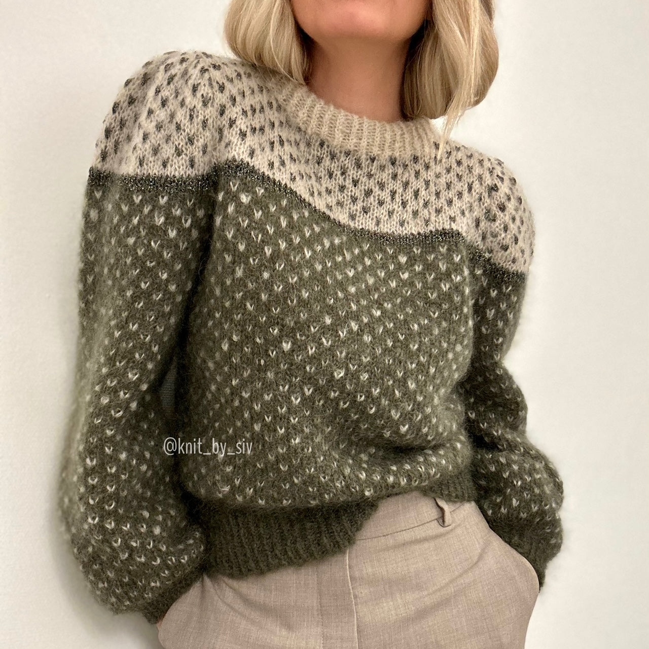 Maipuffblusen er en bestselger i nettbutikken, med fine puffermer. Maipuffblusen juleedition no2 kommer med lange ermer og et nydelig farget effekt garn som inneholder gull og sølvtråder. Strikkes med enkel tråd mohair på pinne 5 mm.